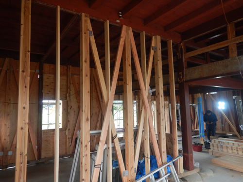 施工写真![]() 3メートルを超える階高は筋違い45×90で壁倍率をとる |