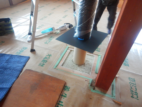床貫通する煙突部にロックウールを入れ断熱材区画の欠損をなくす |