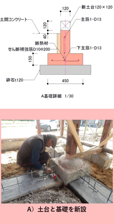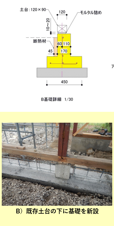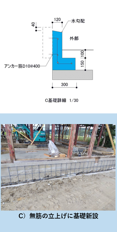 | ■ | ■ | 外周部立上りは無筋コンクリート C)抱き基礎を新設し、既存土台に追加アンカーボルトで緊結 ![]() |