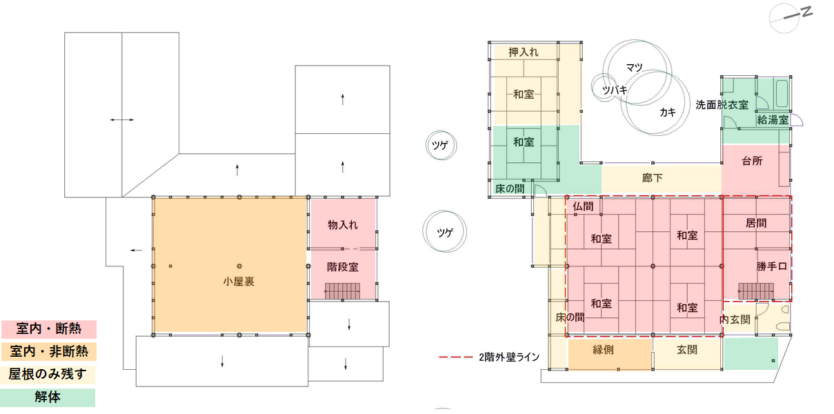 3)下屋の減築バリエーションを検討![]() 劣化の大きな場所は解体 |