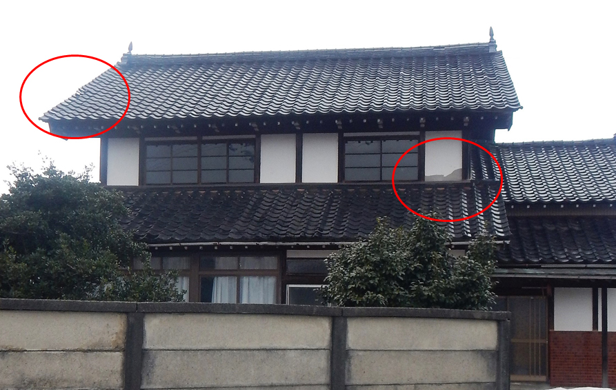 写真右は建物東面で袖瓦のめくれ、しっくい壁の脱落あり。
