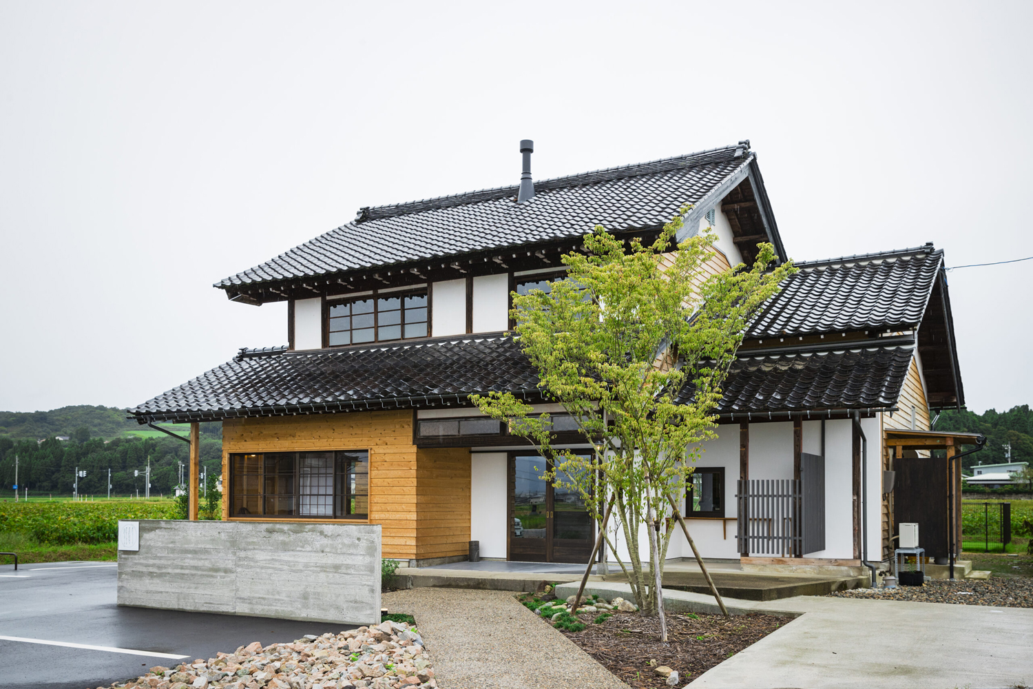 外構計画では、道路沿いという立地において、外からの見え方と内からの視線の抜けの両方を考慮しています。特にシンボルツリーとして配置した落葉樹のヤマボウシは、四季の変化を通じて訪れる人の記憶に残るよう意図しています。