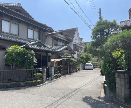 (右写真:周辺は同年代に建てられた住宅が立ち並ぶ)