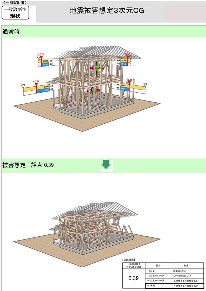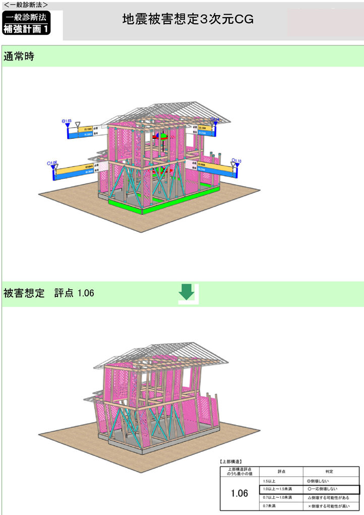 Before![]() 上部構造評点 0.39「倒壊する可能性が高い」 建築基準法の想定する大地震動時を想定 |