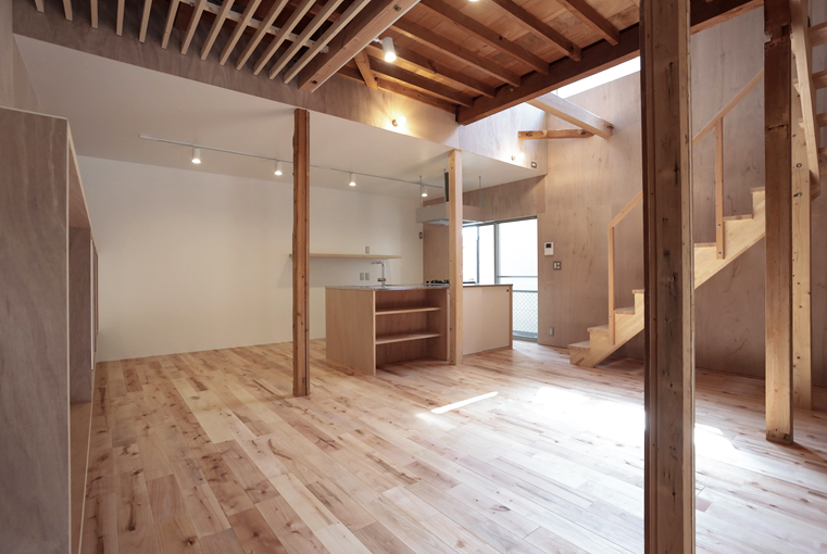 宮本善州建築設計事務所さんの事務所と自宅の改修事例です。お子さんの成長に伴い戸建てを探されていた所、築古で資産価値が付かず「土地」として販売されていた物件と出会い。解体される予定の建物を不動産屋に掛け合い 上屋付き で購入されました。