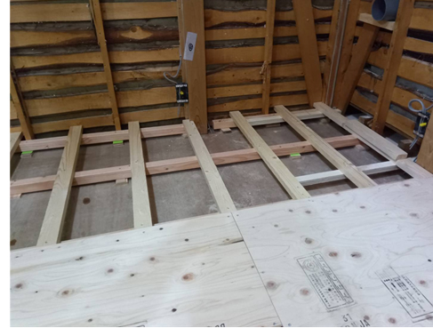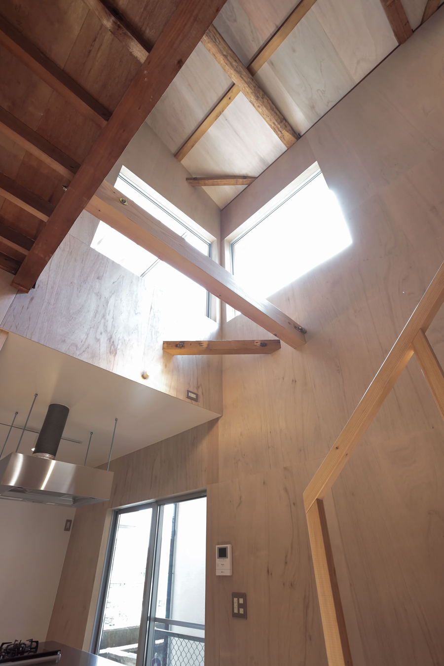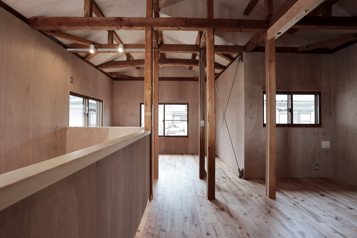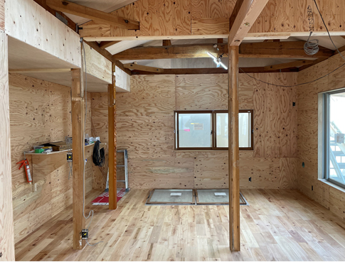 内部は構造用合板にて新たに耐力壁を設置。床は下地に段差が生じていた箇所は根太を組み、新たに24㎜の構造用合板で水平構面を構成。