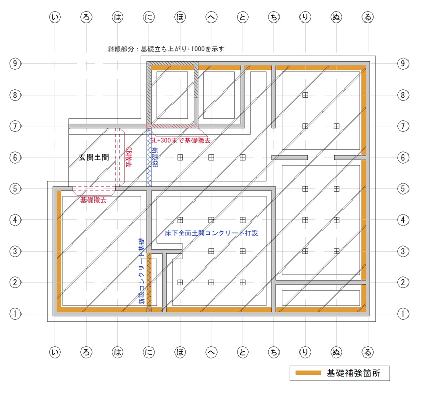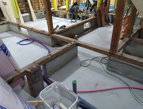 ・既存の布基礎の立ち上がりにケミカルアンカーを用いて建物内部に基礎を増し打ち。
