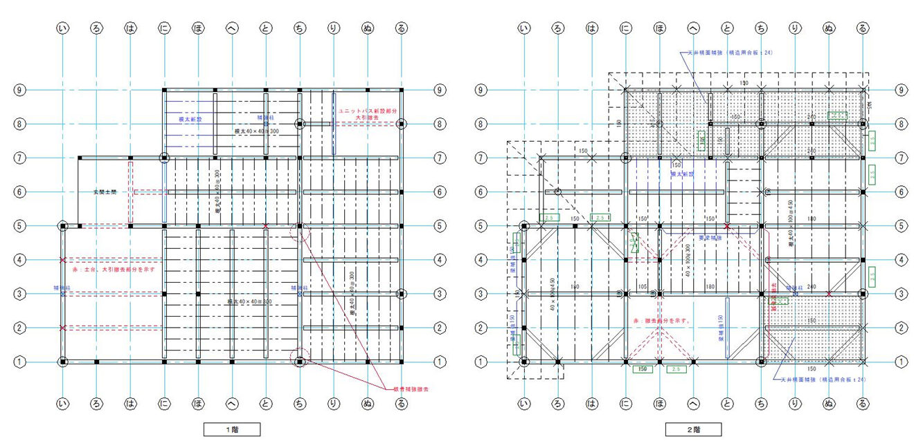 ![]() 左図)1階床伏図 右)2階床伏図と小屋補強箇所 (ち)通り, 過去の増築による鉄骨梁を撤去し、新たに柱を追加し耐力のバランスを整えた。 ![]() |