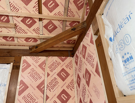 ・天井断熱:ネオマフォーム60㎜。既存の垂木間に納めた。