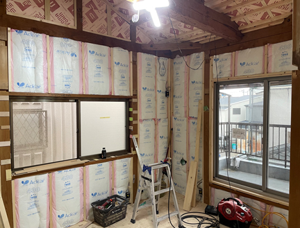 ・壁断熱:高性能グラスウール24K 100㎜を基本とし、一部既存の筋交いや下地が撤去できず、厚みが不足するところはネオマフォーム使用。