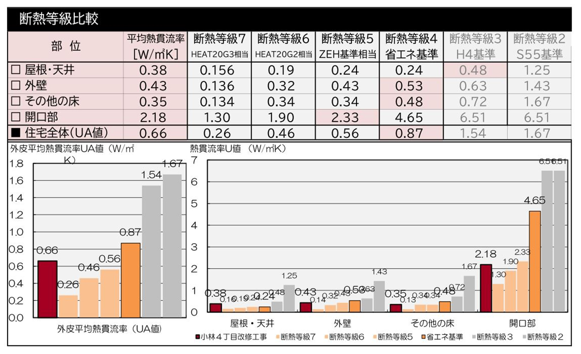改修後の断熱性能![]() 改修後の外皮性能 (赤はM邸) 図左:UA値 図右:部位別のU値 (環境デザインサポートツールを使用) 外皮平均熱還流率UA 0.66W/㎡K 熱損失係数Q値 2.29W/㎡K |