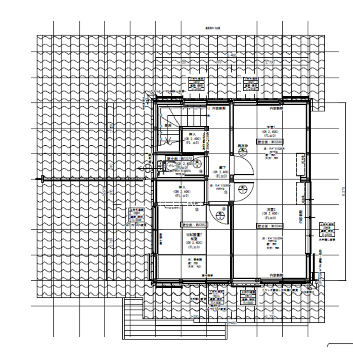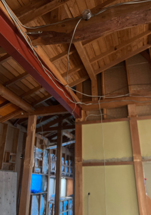 建物調査は2024年4月、小屋裏および床下、外観や設備機器などについて目視調査を実施。(躯体内など事前調査では確認できなかった範囲は、着工後に行った。)確認申請図書は残っていたが増築部分は記載なし。増築部分に鉄骨の梁があった。外壁の剥がれや屋根の割れがあったが、水漏れなどはなかった。基礎も乾燥していた。大工にきてもらい、レベルをはかり計測したところ和室やリビングの床は最高2センチほど下がっていました。