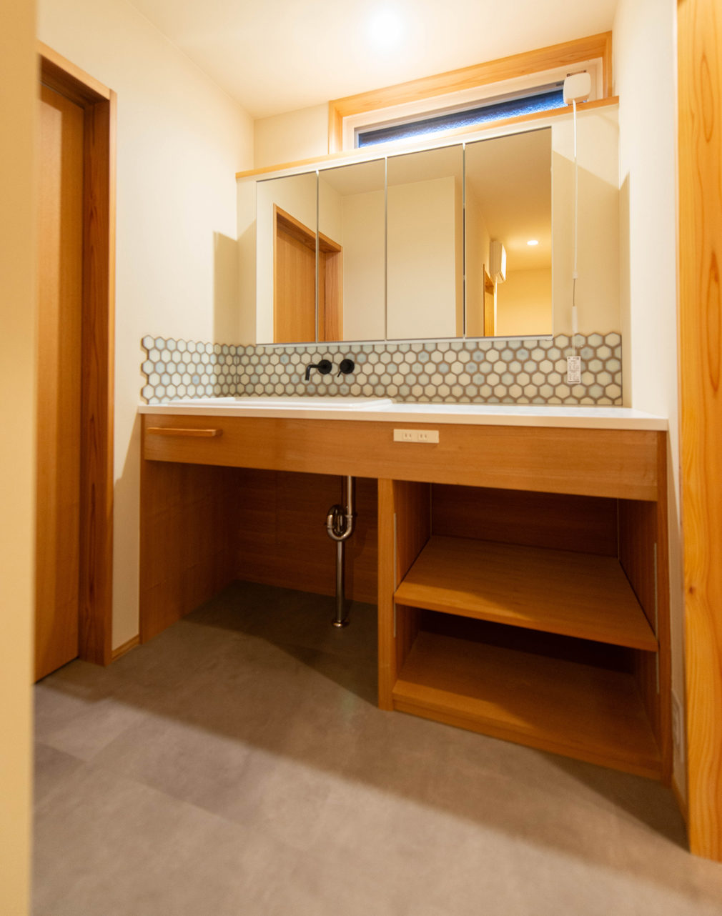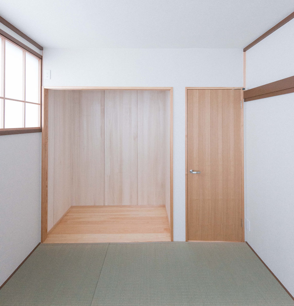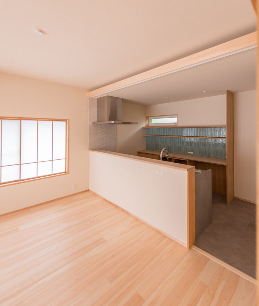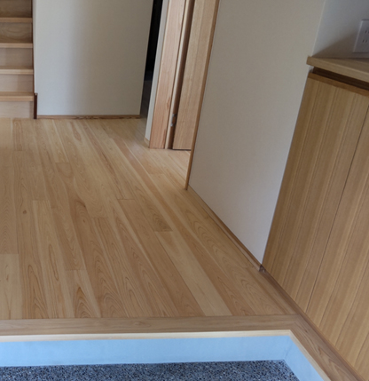 ●自然素材を感じられるように、床材に桧(静岡県オクシズ材)を提案した。玄関やカップボードは造作の物を作った。