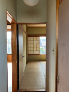 建物は大工が建てたものではあるが、裏の家と同じ時期に分譲で売られていたもの。リビングとダイニングが別々の部屋で使いにくい、浴室はタイル貼り、和室が二間続きで2階は子供部屋となっていたようだ。瓦屋根で南側に窓が多いため耐震は南側の耐力不足となった。また2階の下に耐力壁がないところもある。