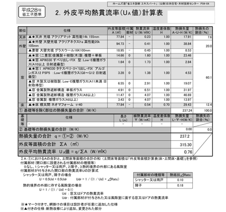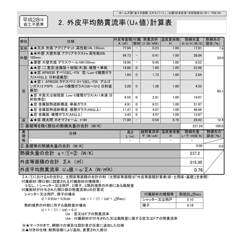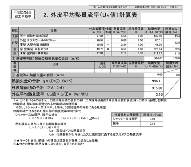 外皮平均熱貫流率(UA値)計算表