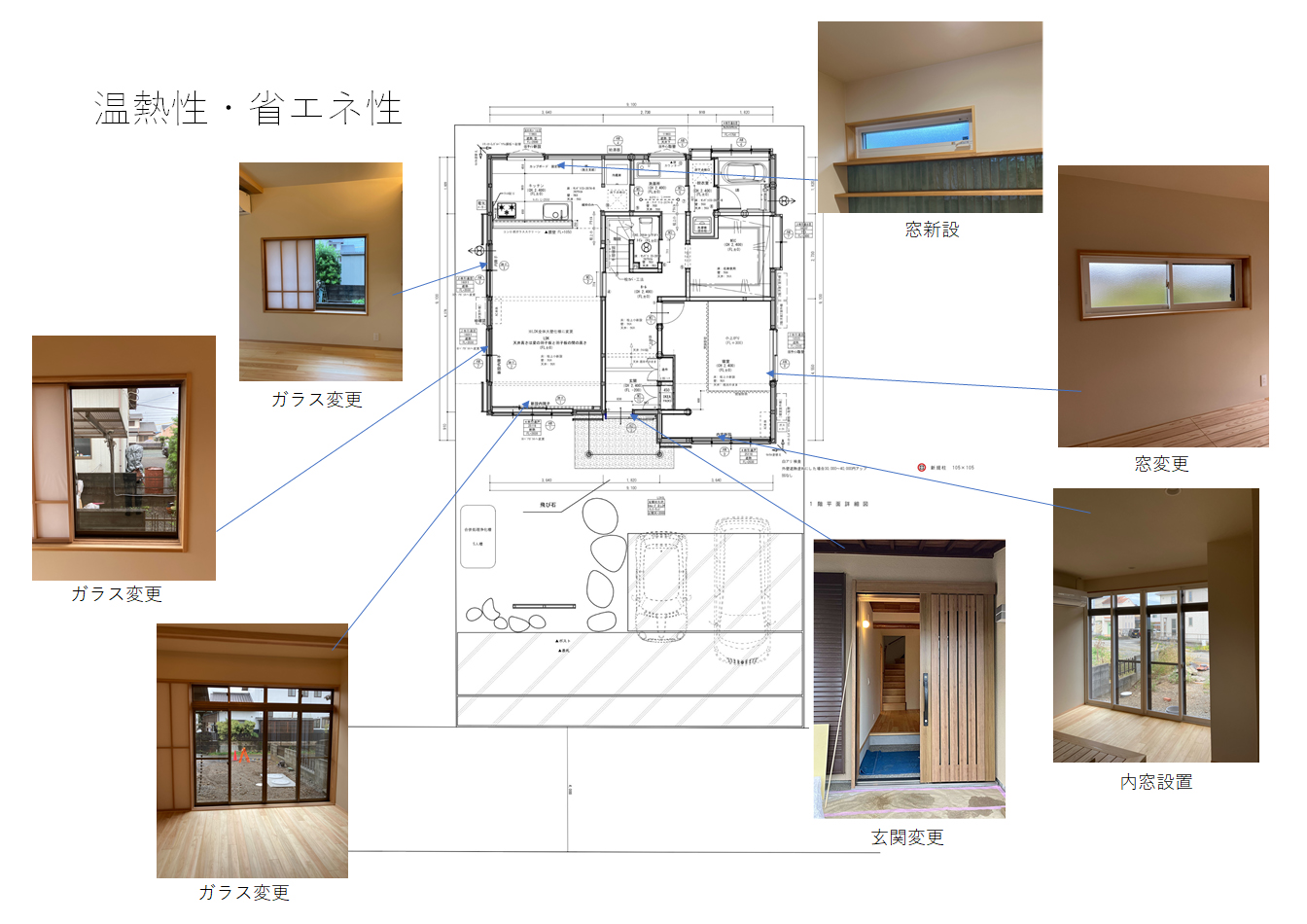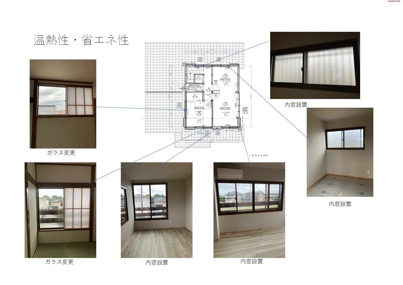 リビングの窓は内窓ではなく、障子をつけたいというご要望がありましたのでガラスの変更をしました。寝室などの寝る部屋は窓の変更と内窓の設置をしました。またプランでキッチンが暗くなってしまうので窓の新設をしました。