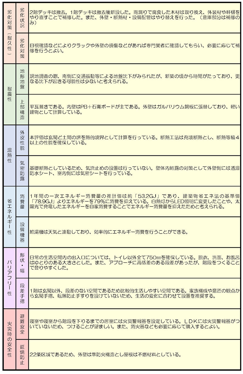 住宅医による性能向上診断、劣化対策、耐震性、温熱性、省エネルギー性、バリアフリー性、火災時の安全性など、3次インスペクション調査を行った。
