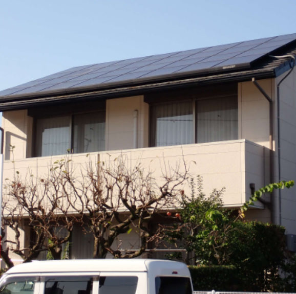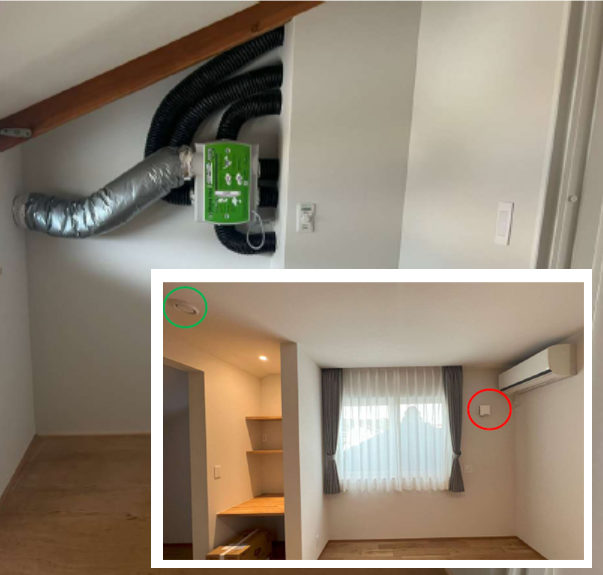 グリーンファン:第三種ダクト式換気、換気性能の安定性と維持管理の容易さからいつも採用している。赤丸は給気、緑の丸は排気口 既存の太陽光パネルを活用