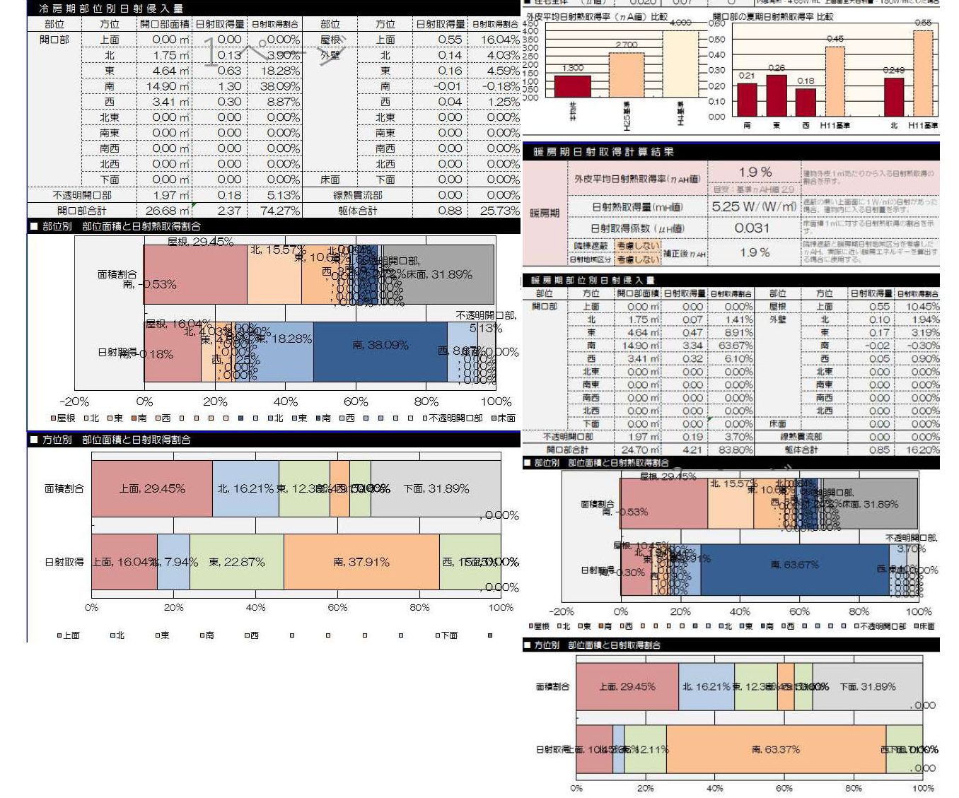 グラフは Before冷房期:部位別 部位面積と日射熱取得割合, 方位別 部位面積と日射熱取得割合