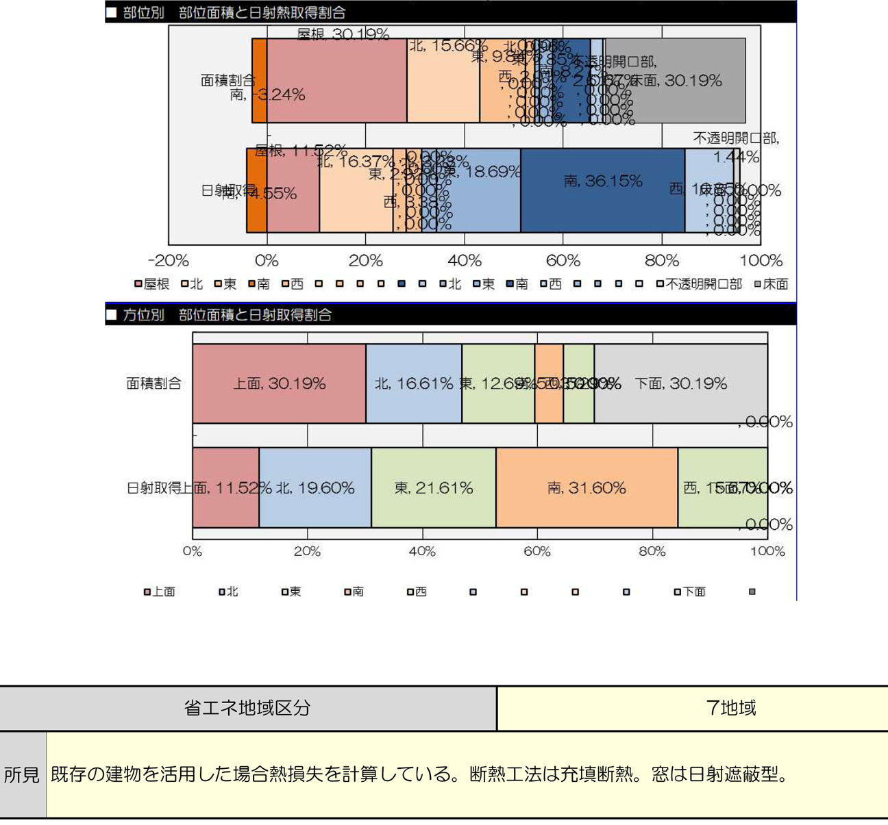 省エネ地域区分7地域 玄関土間の堺を熱的境界として計算を行っている。グラフは 部位面積と熱損失割合(換気除く), (換気含む)