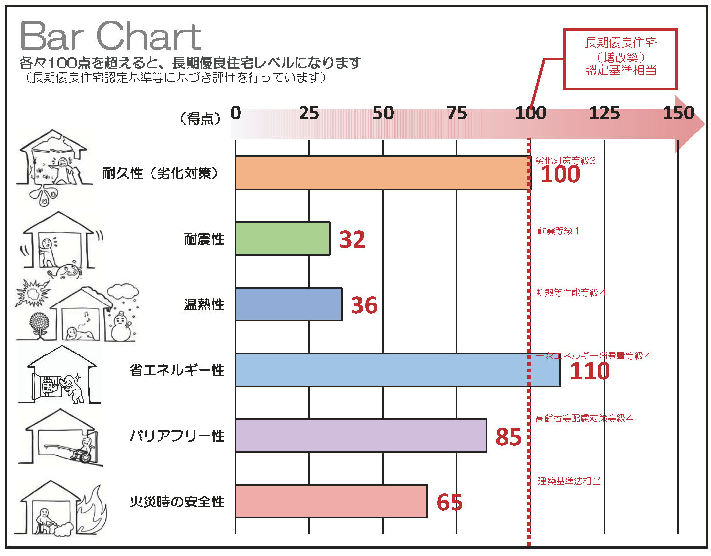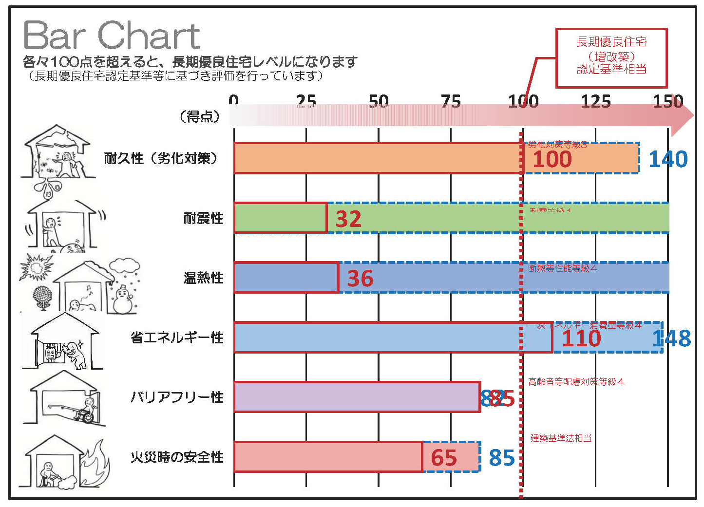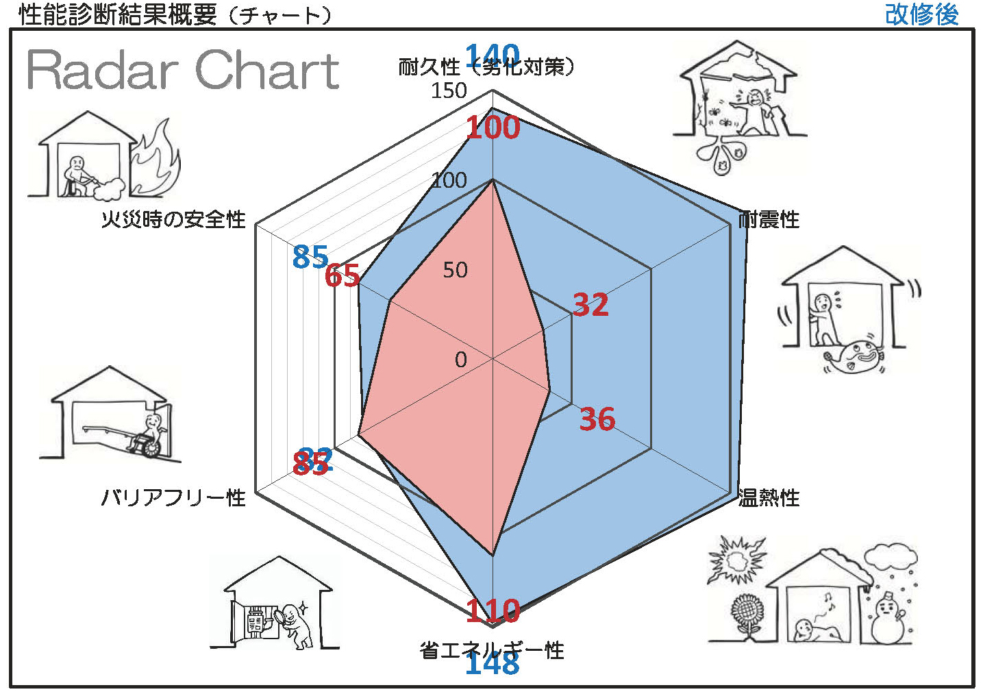 改修前の建物性能:ピンク、改修後:ブルー改修後:住まいの診断レポート(性能診断結果概要シート)
