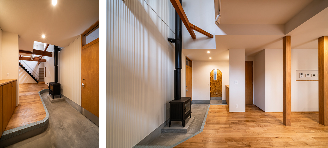 薪ストーブの背後の仕上げは特定不燃材 ガルバリウムスパンドレル ZiGを採用
