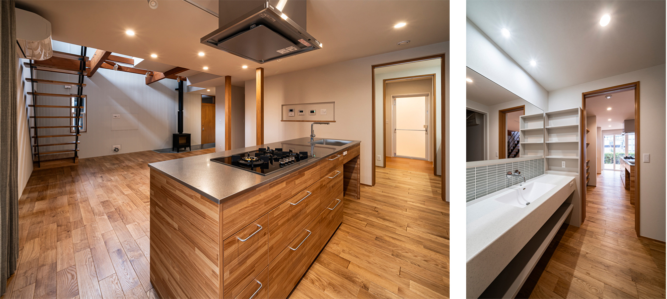 会話が広がるLDK。キッチンから、ランドリースペースやクローゼットにつながる。