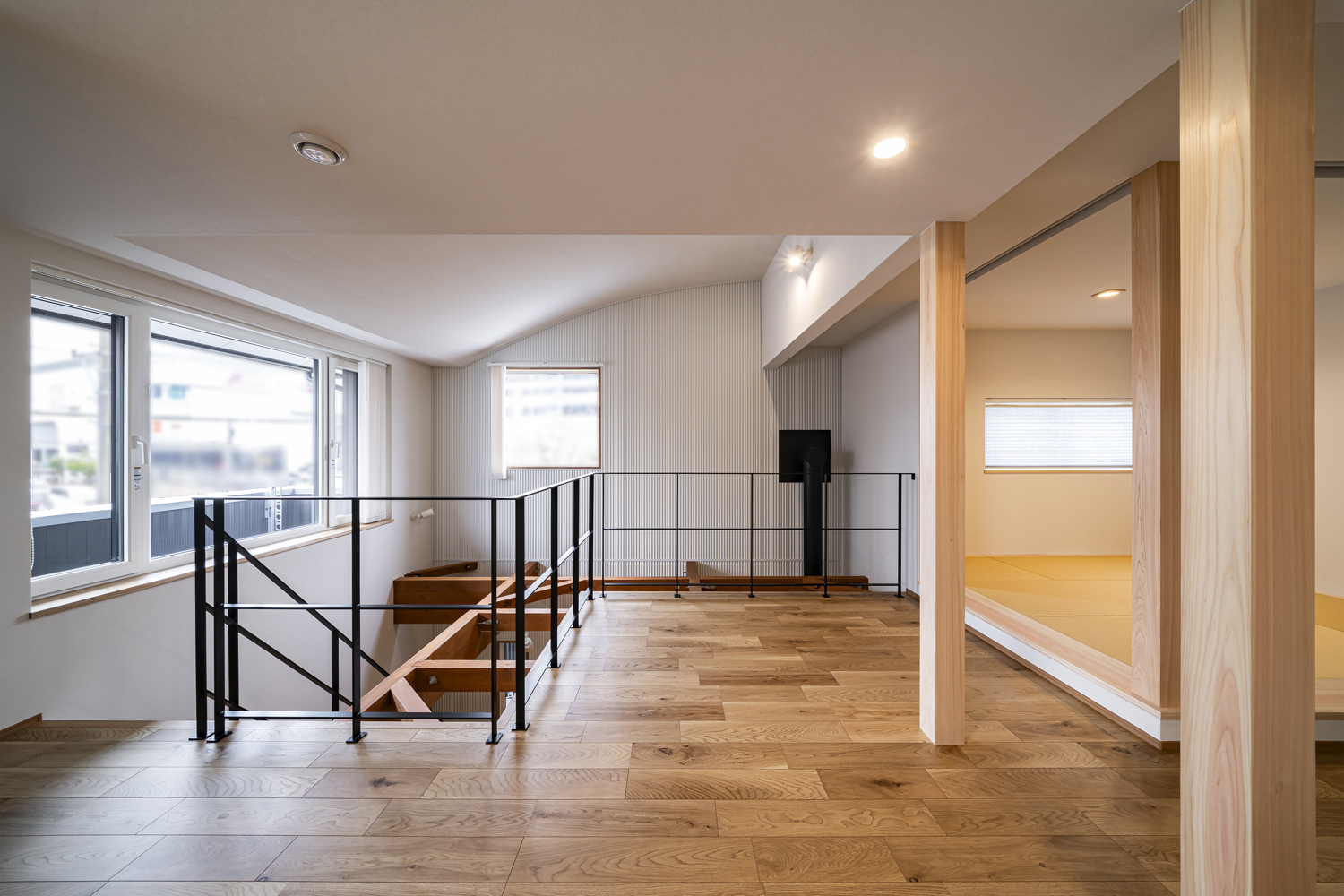 階段の位置を変更 既存のR天井をそのまま生かした。2階の和室と将来の子供部屋は将来、間仕切りで仕切れる様に下地補強が行われている。