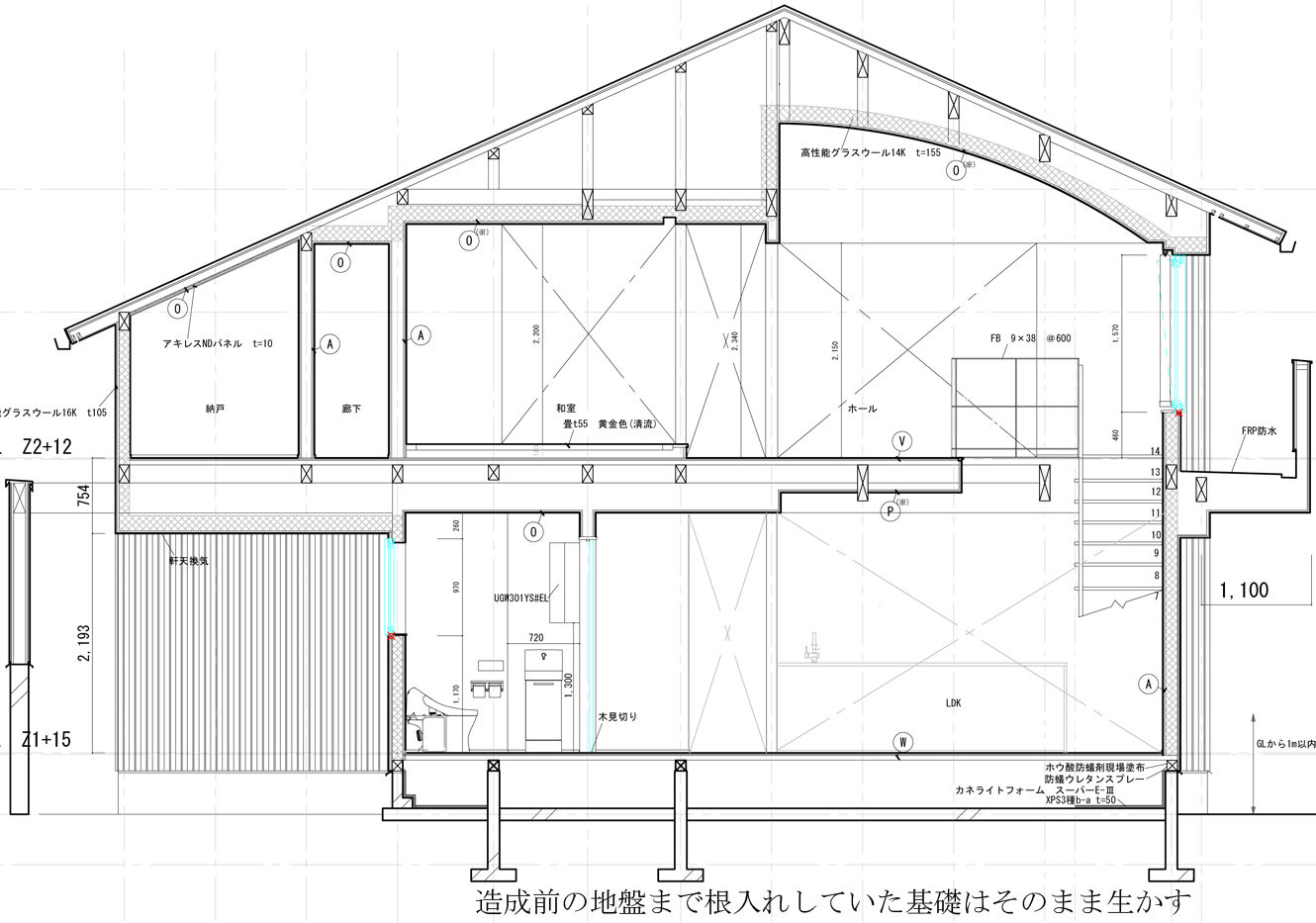 天井:高性能グラスウール 14kg t=155