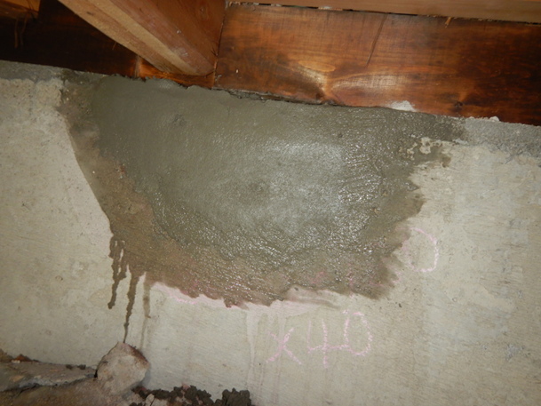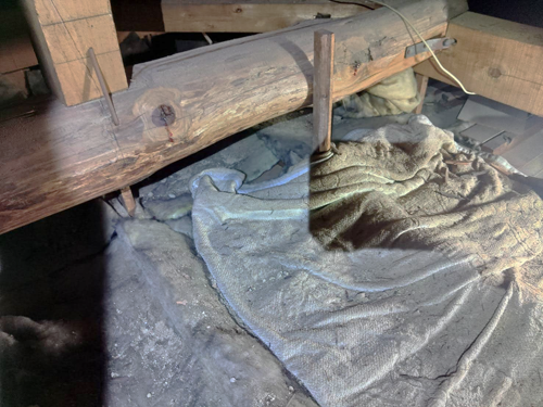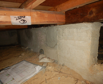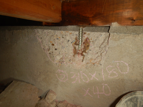 改修計画 をもとに床下と基礎および小屋裏等2回目の調査を行った。確認申請図書とは異なり、基礎は無筋であったこと、また、ケミカルアンカー設置の際と思われる基礎の欠損がみられた。小屋裏は健全な状態であり、横架材は金物で緊結されていた。