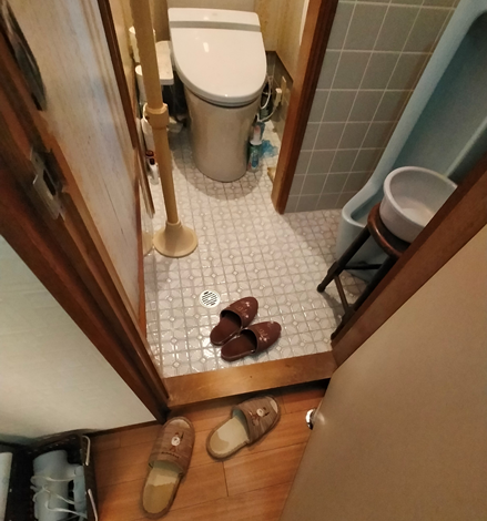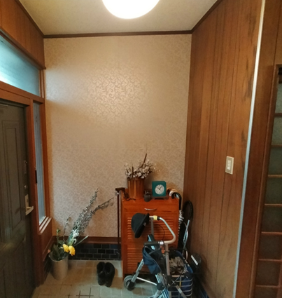 建物は、1977年 新築で確認申請書等が残されている。一部の工事を除き、現在まで大規模な増改築は行われていない。玄関にはシルバーカーが置かれ狭く、後ろ向きに移動している。1階トイレの開口部が狭く、70㎜段差あり。居室から離れている。浴室はユニットバスに改修済で段差なし。