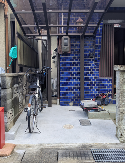 - バリアフリー性:トイレは、居室近くに移設し、動線を短くするとともに、手すりを取付けるための下地を設けケアマネさんと相談し手摺を設置。引戸やバリアフリーに配慮した。シルバーカーの設置位置を計画した。(右写真:外構の塀や植栽を一部撤去し、シルバーカーや自転車置き場として活用)