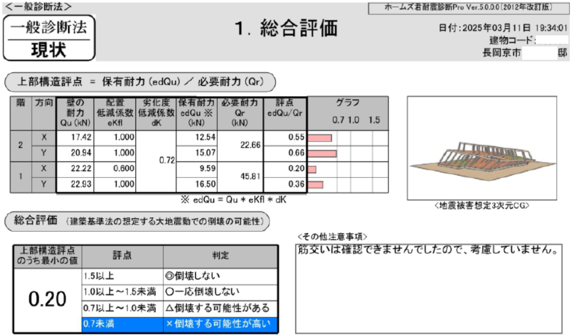 改修前の上部構造評点は、0.20「× 倒壊する可能性が高い」