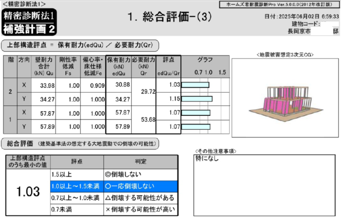After 改修後の耐震診断は精密診断法1により実施した。![]() 改修後の上部構造評点は、1.03「〇 一応倒壊しない」 図:事例№169 精密診断法(ホームズ君耐震診断Pro Ver.5使用) |