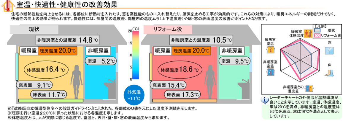・快適性:暖房期における居室の体感温度の改善と洗面室浴室との温度差軽減 Before After シミュレーション