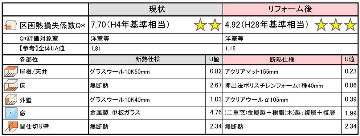 - 温熱性:断熱改修は部分改修とし、窓(玄関物入をのぞく開口部)・床(1階居室)・天井(1階DK・洋室、2階全室)および外壁(耐力壁設置部のみ)に実施した。区画熱損失係数Q* 4.92 (H28年基準相当)。UA値1.16 (6地域 等級3)