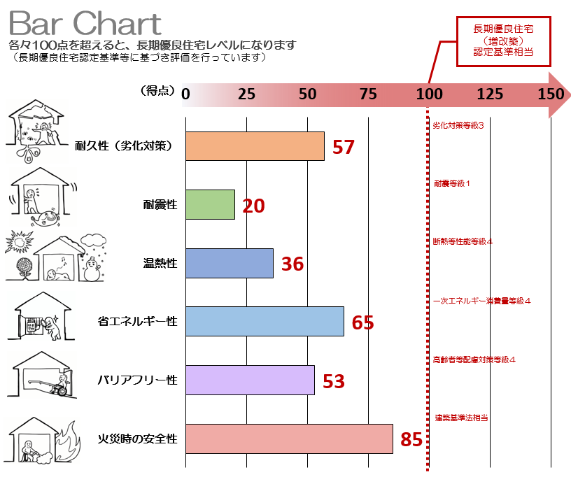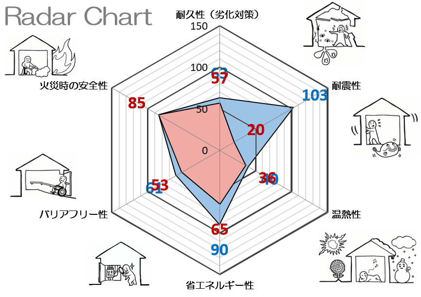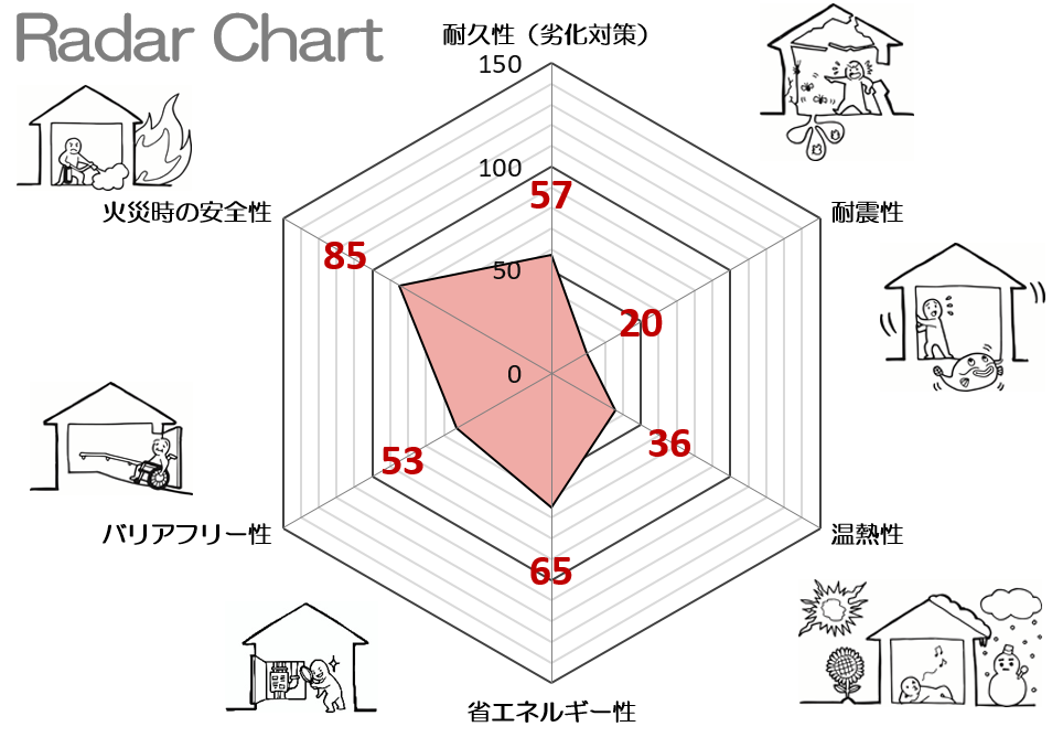 ご依頼内容は耐震改修。既存建物の6つの性能は耐震性能がもっとも低い。