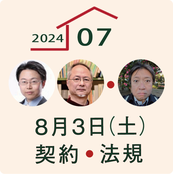 第7回 2024年8月3日(土)開催 ・住宅改修のトラブルを防ぐ[契約、責任、トラブル事例と予防方法]中尾太郎 + 木津田秀雄 ・既存住宅改修と関係法規[最新法規、遡及事項、確認申請の実務を学ぶ]稲岡宏