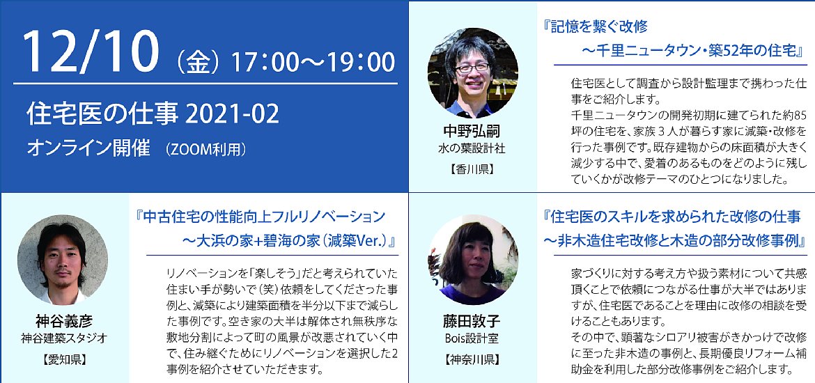 □「住宅医の仕事」は、全国で活躍している住宅医の仕事を発表し合う場です。2021年第2回は、愛知県、香川県、神奈川県の3名の住宅医による仕事をご紹介します。