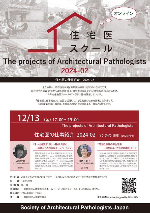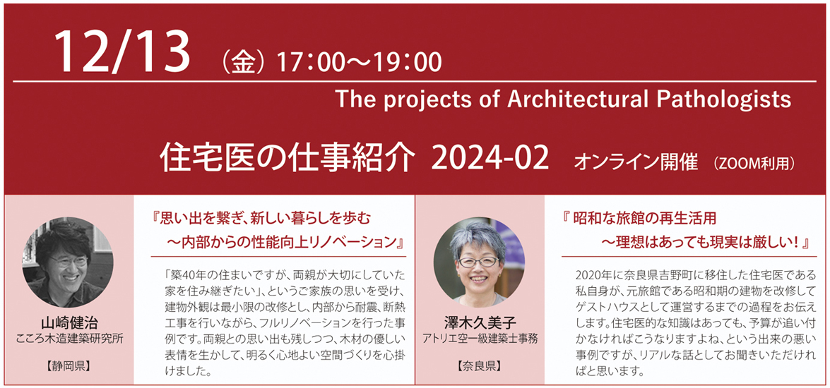 ■「住宅医の仕事紹介」は、全国で活躍している住宅医の仕事を発表し合う場です。2024年第2回は、静岡県、奈良県の2名の住宅医による仕事をご紹介します。