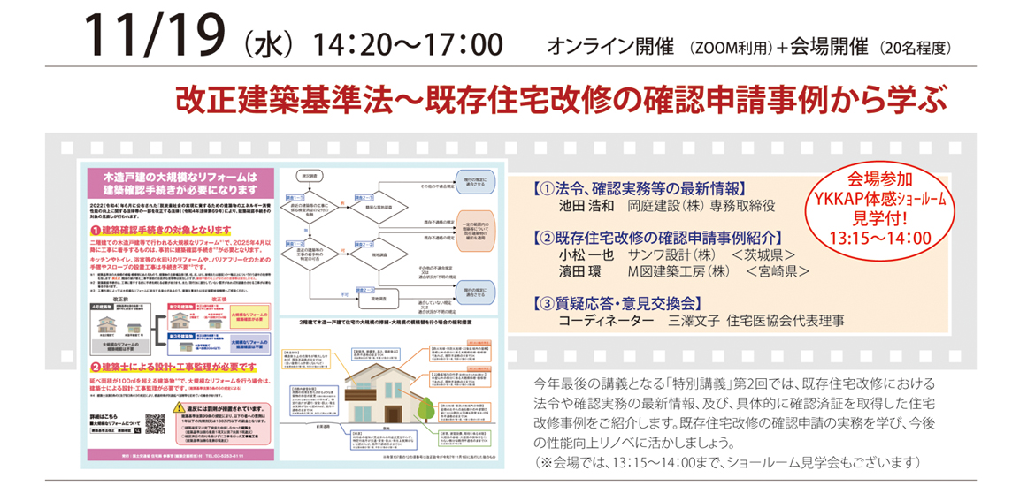 春に改正された建築基準法について、スクールのレギュラー講義やスキルアップ講習会でも取り上げて来ましたが、今年最後の講義となる「特別講義」第2回では、既存住宅改修に関する法令や実務の最新情報、及び、具体的に確認済証を取得した住宅改修事例をご紹介します。